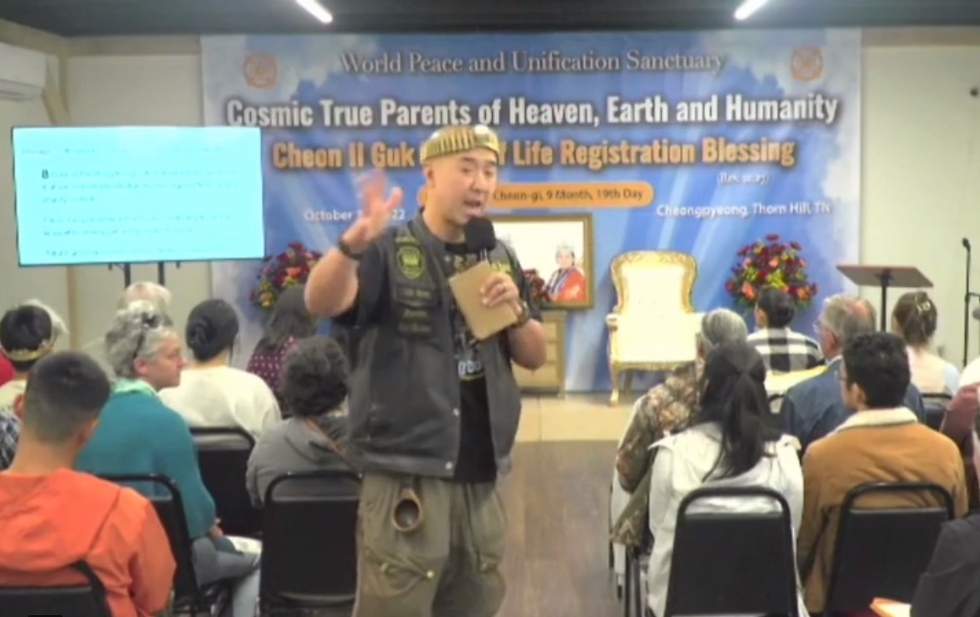 Hyung Jin Nim começou o culto observando o comentário de Trevor Loudon no Festival da Liberdade de que a Ásia teria sido engolida pelos comunistas se o Rev. Moon e os Unificacionistas não tivessem se levantado e educado tantos.